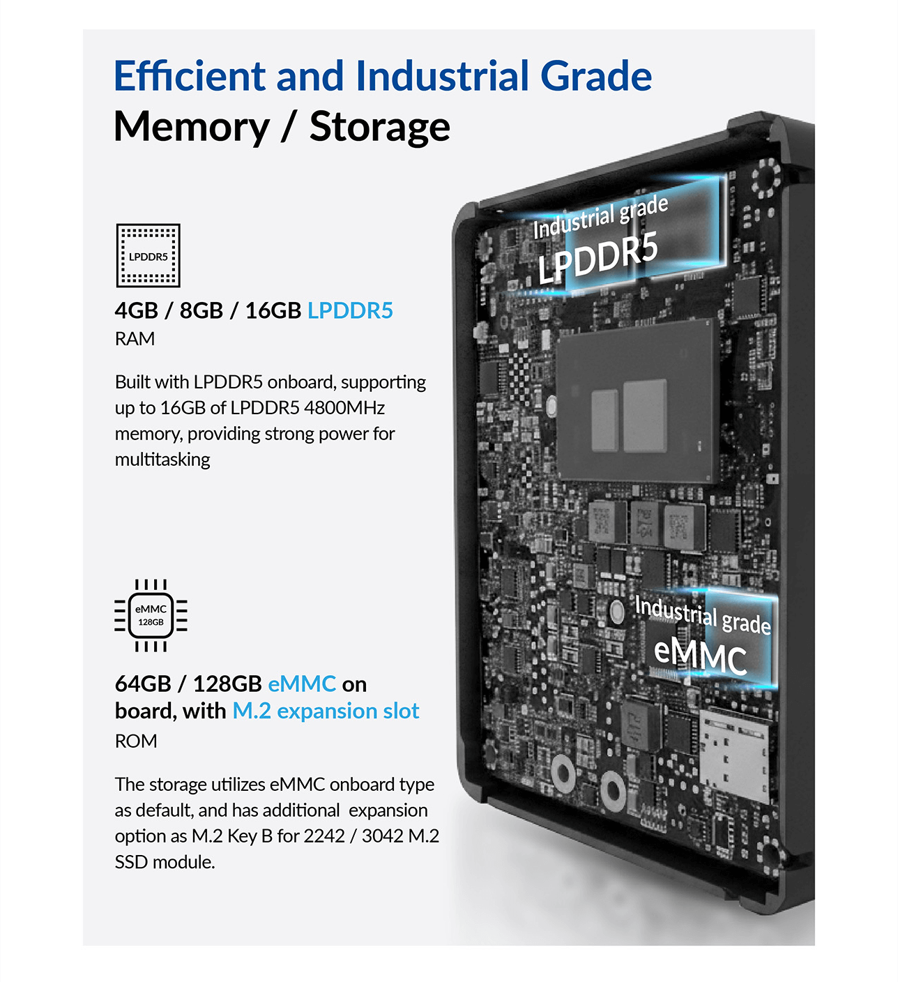 | STORAGE | 1 x Industrial grade eMMC (64GB/128GB), 400MB/s | ||