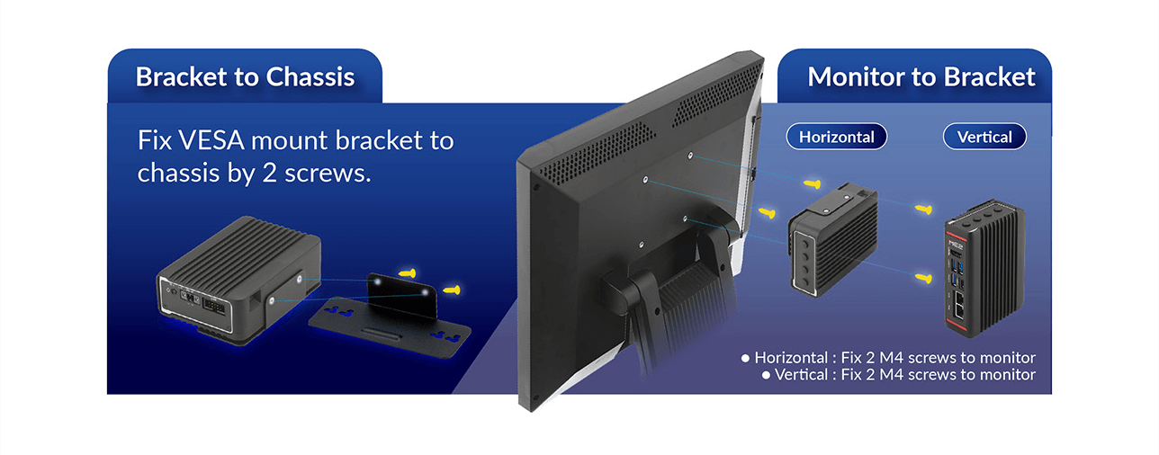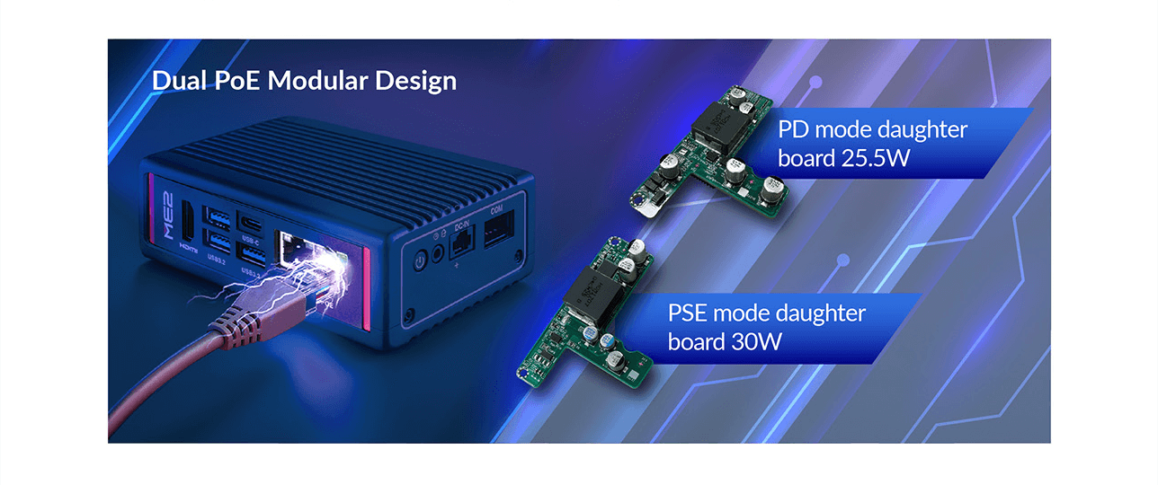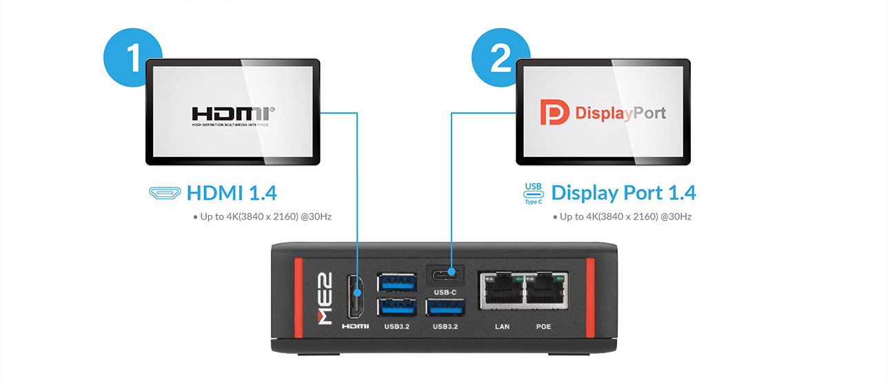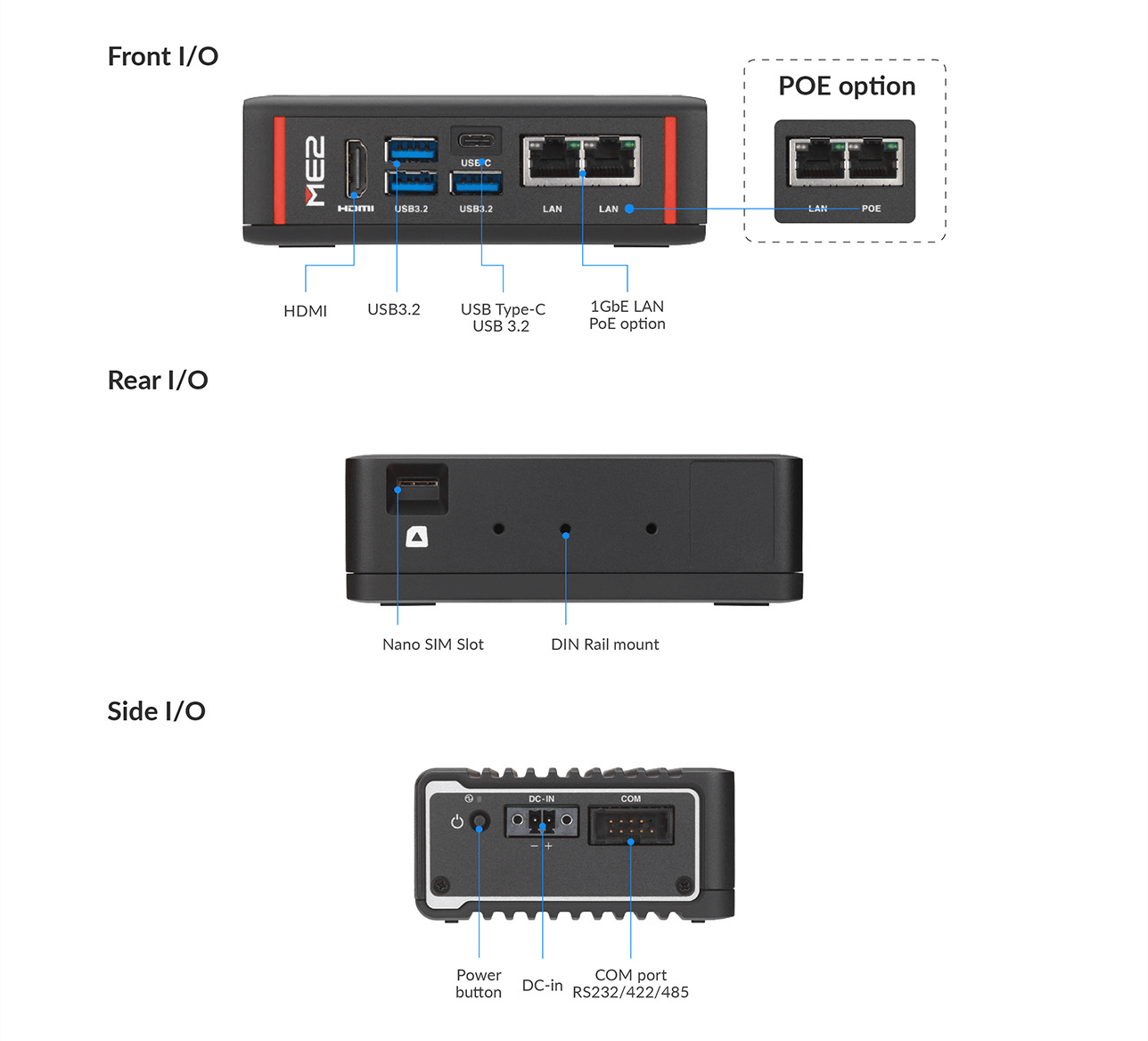| FRONT I/O | 3 x USB 3.2 Gen2 / 1 x USB 3.2 type C (Support display(5V/3A) and audio) / 2x RJ45 (1x POE option for PD mode or PSE mode) / 1 x HDMI 1.4 (Vertical) | ||