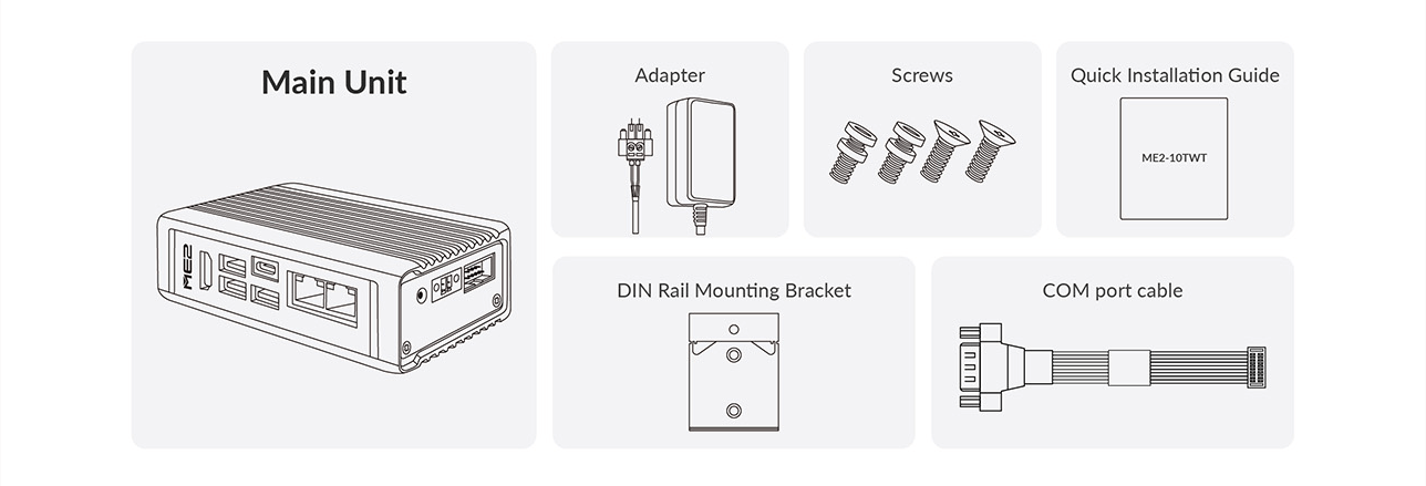 | PACKING LIST | PACKAGE | 1 x Quick Installation Guide / 1 x Embedded System / 1 x Screws kit / 1 x DIN-Rail Mount Bracket / 1x VESA Mount Bracket (BOM option) / 1 x COM port cable / 1 x AC Adapter + US & EU power cord | |