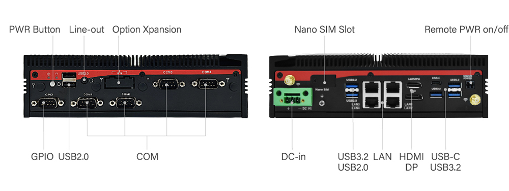 | FRONT I/O | 2 x SMA Antenna (Optional for WiFi/LTE function) / 3 x RS232 / 8-bit GPIO in DB9 type / 2 x USB 2.0 / 1 x RS232 / 422 / 485 / 1 x Line-out / HDD LED / Power Button w/ Power Indicator |