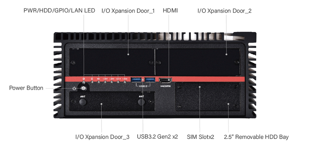 | FRONT I/O | 1 x HDMI 1.4 / 2 x USB 3.2 Gen2 / 2 x SIM Card Slot w/ Cover / 1 x 2.5" SATAIII HDD / SSD Bay |