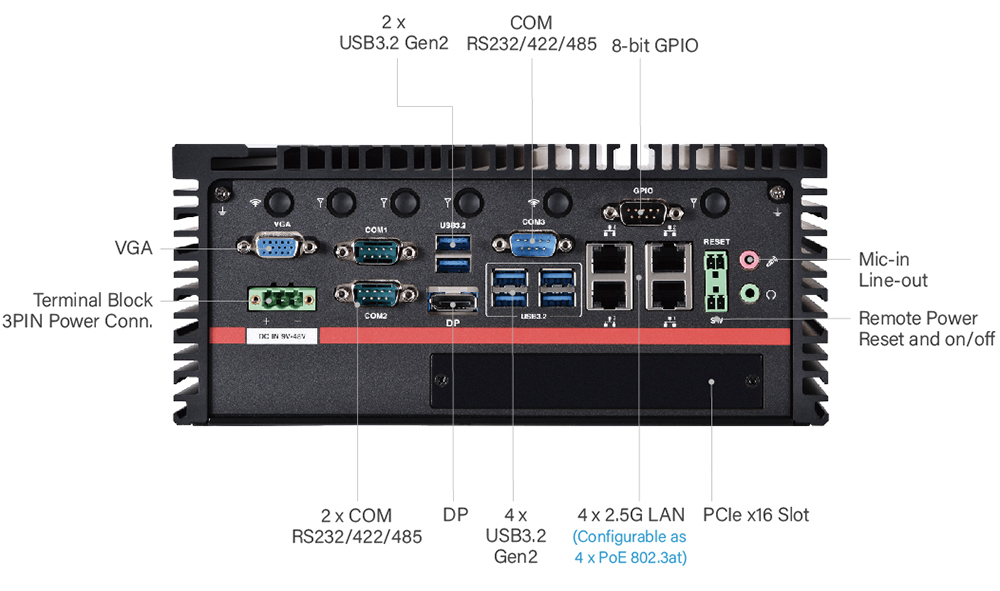 | REAR I/O | 4 x RJ-45 / 6 x USB 3.2 Gen 2 (10 Gbps) / 3 x RS232 / 422 / 485 (Support Power 5V / 12V) / 6 x SMA Antenna (Optional for WiFi/LTE function) / 1 x 8-bit GPIO (in DB9 Connector) / 1 x DisplayPort 1.2 / 1 x VGA / 1 x Mic-in / 1 x Line-out / 1 x PCIe x16 slot / 1 x 2-pin Terminal Block Remote Power Reset / 1 x 3-pin Terminal Block Power Input / 1 x 2-pin Terminal Block Remote Power on / off |